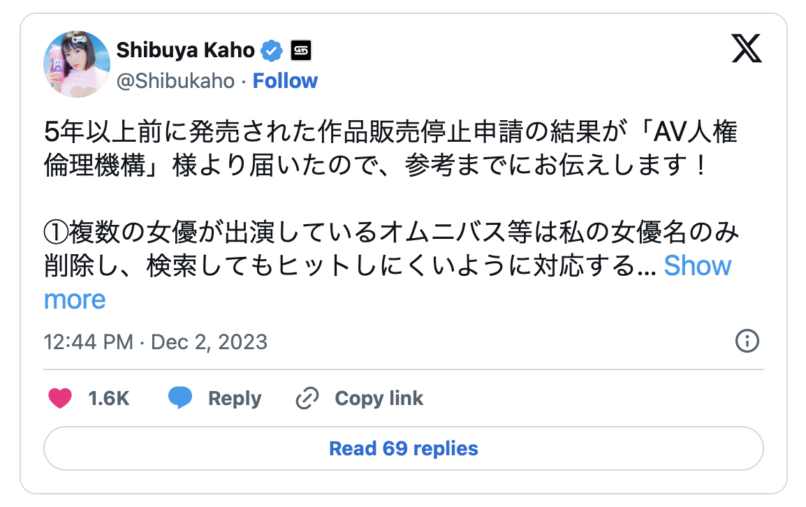 这件事现在有后续,Shibuya Kaho在X发文,目前是有3种状况: