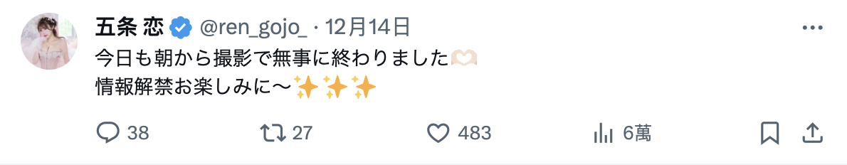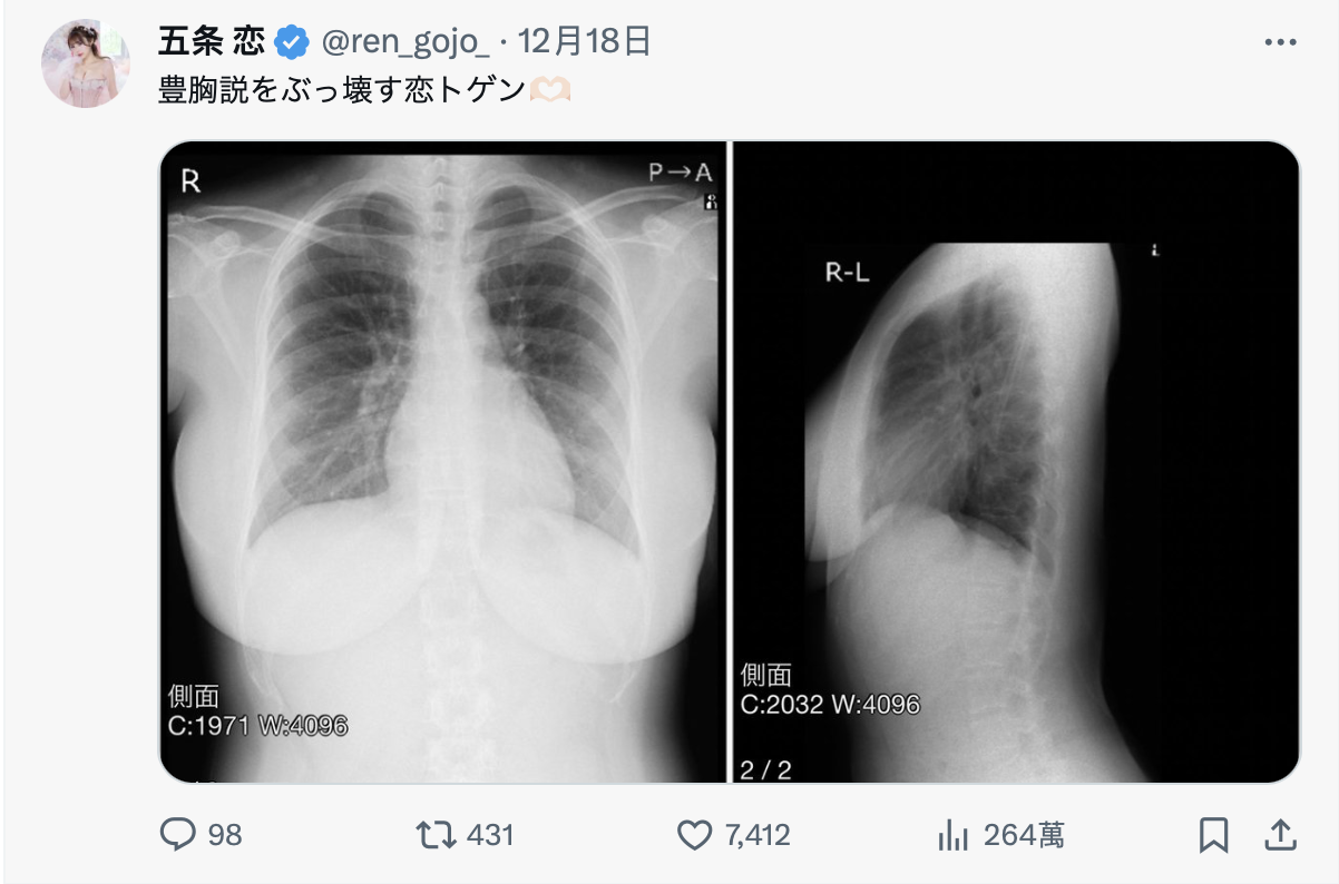 其实她最近动作不少:有去杂志拍照,有发行写真集的计画,还因为被说是假奶还PO了X光照给大家看身体里面没有假体的存在⋯所以不用担心,明年(2024 )会是五条恋活跃的一年,请大家务必来TSE来找她玩,就算脸蛋不是你的菜,也该来看看她壮观的J罩杯吧〜