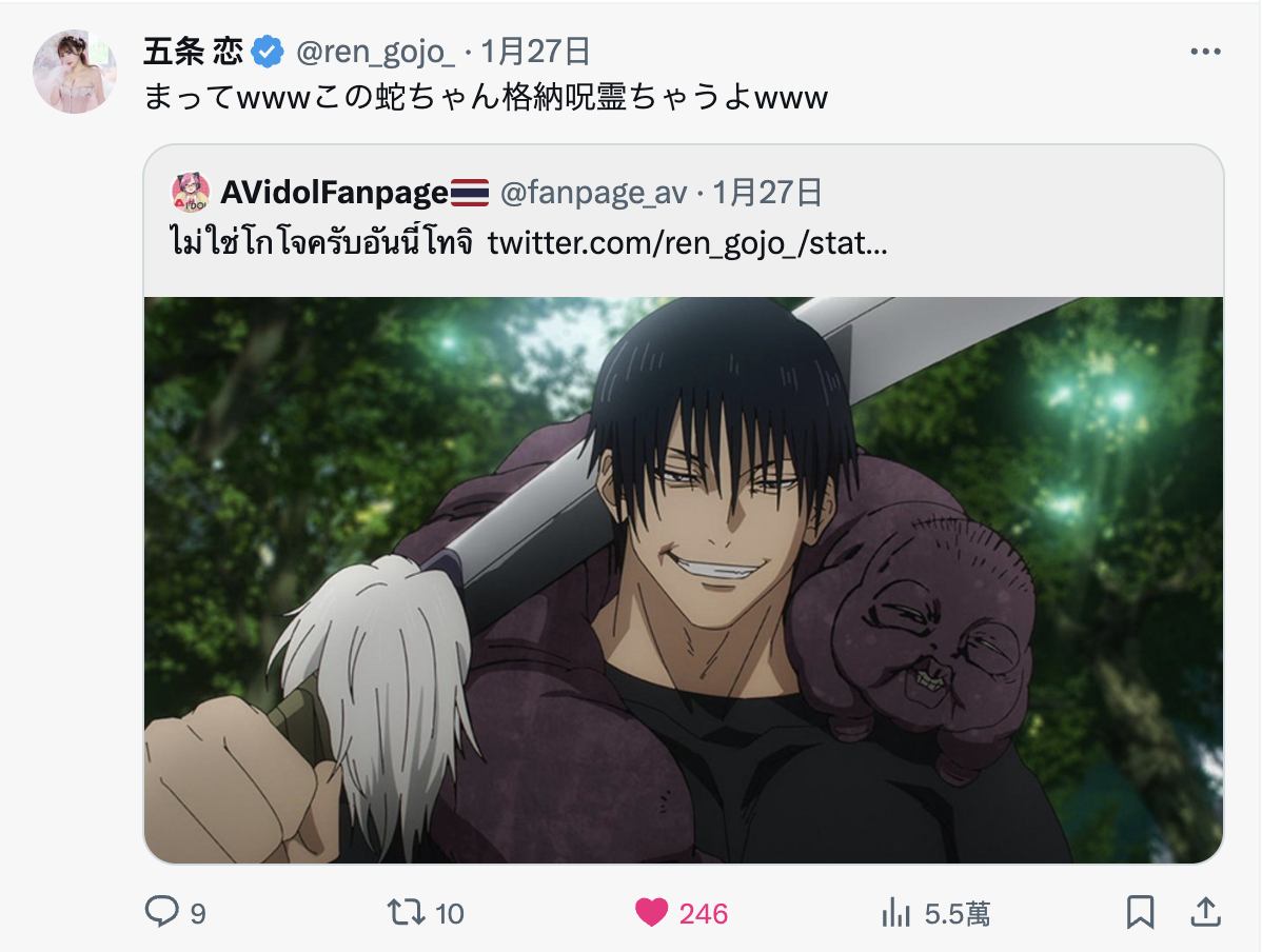 女优有多爱动漫呢?从这次代表AVway参加的五条恋就可见一般,不用我说,看到艺名就知道片商和事务所是取材自动漫「咒术迴战」的五条悟,我一直很想知道这个艺名的由来以及她对这个艺名的想法,结果看到她手机的桌面我就决定少问两句,直接切入正题了: