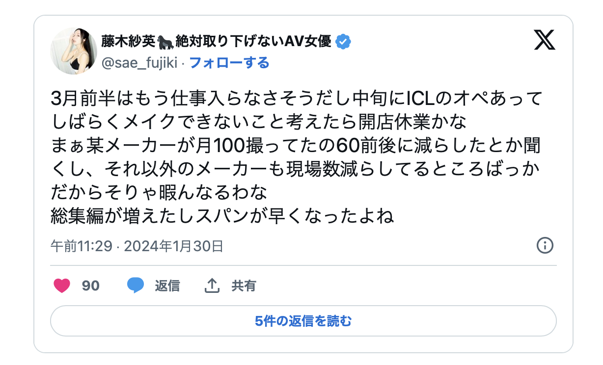 消息来源是女优「藤木纱英」的X(https://twitter.com/sae_fujiki/status/1752172080429482358),她说自己听到过去某家每个月会发100支作品的片商现在下滑到只拍60支左右,其他片商也都减少了拍摄作品的数量,取而代之的是更多的精选辑〜