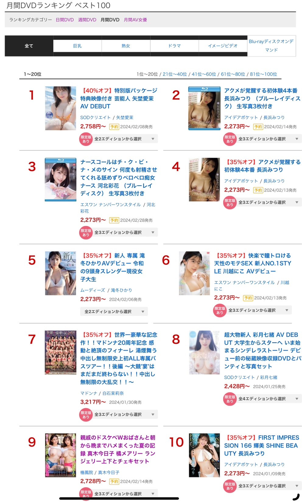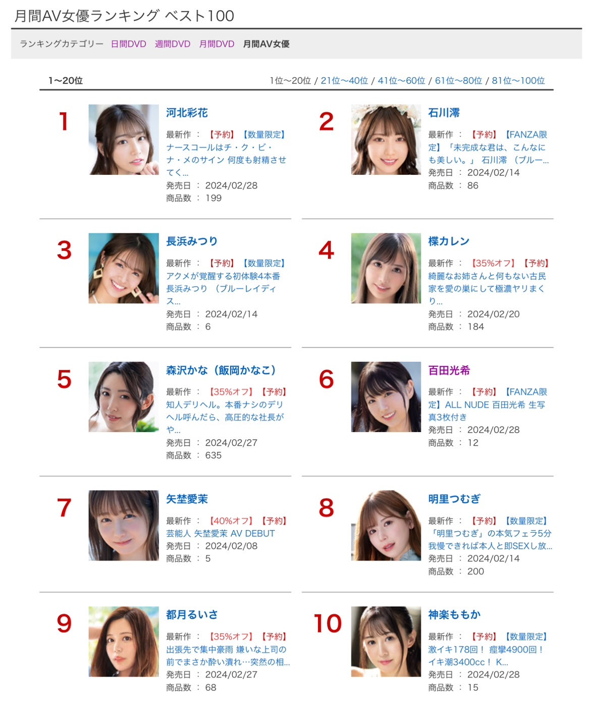 一样,我们先来看是哪一只作品最为卖座:这次参考的资料一样是由网站Fanza 提供的2024年1月实体作品销售排行榜,敏感度很高的,你一定知道哪一只作品最有拿下冠军的本钱,现在,就让我宣布答案: