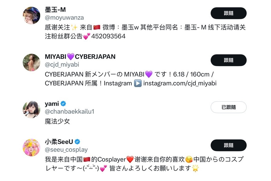 她叫丸石レア,レア是「rare」的意思,所以在去年12月就注册X(https://twitter.com/Maruishi_Rea)的她很快就替自己取好了「丸石稀有」的中文名字;另外,虽然她说自己不懂中文,但观察她的追踪名单还真多华人圈的Cosplayer⋯