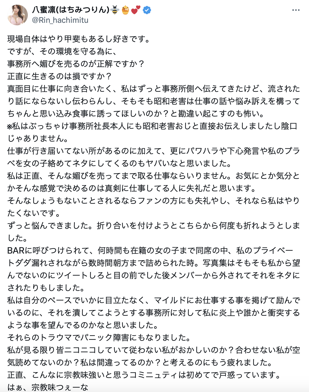 昨天,八蜜凛在自己的X(https://x.com/Rin_hachimitu)发表长文,就算不懂日文就算Google翻译常失真但拼凑一下也知道她碰到了很糟糕的状况:八蜜开头就说她很喜欢工作,因为那带给她成就感,但接下来她就问了:「然而为了守护这个工作环境讨好事务所是正确的做法吗?诚实地生活做自己不对吗?」